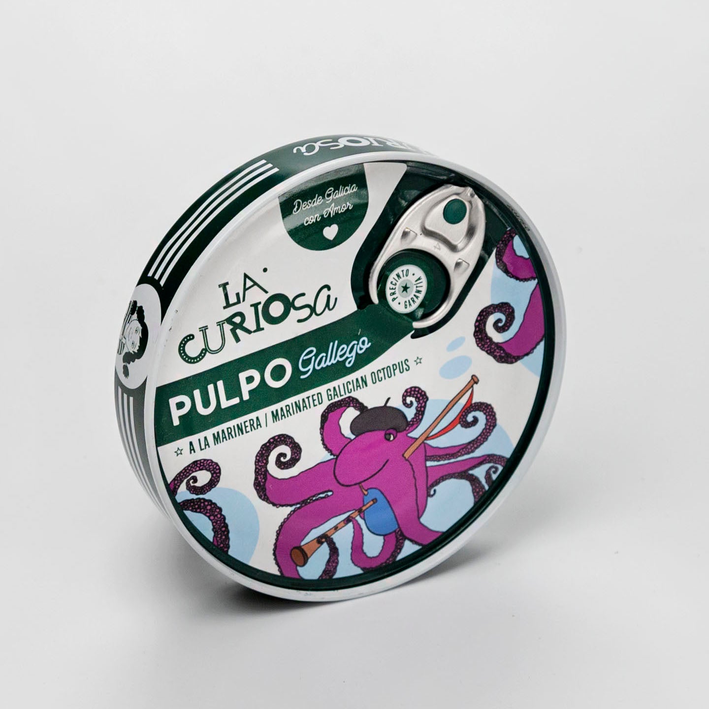 Esta conserva recrea la receta tradicional gallega de pulpo, con origen en las aguas puras de Galicia. Cada trozo de pulpo se cocina con esmero y se aliña en una mezcla de aceite de oliva virgen extra, pimentón dulce y sal marina. La textura suave del pulpo, unida al sabor ahumado del pimentón, ofrece una experiencia de sabor inigualable, ideal para disfrutar solo o en distintas preparaciones. Es una auténtica muestra del sabor de Galicia. El distintivo sello de calidad de PESCADERÍAS, garantiza que este pulpo tiene su origen en las cristalinas aguas de Galicia, tierra famosa por sus productos del mar.